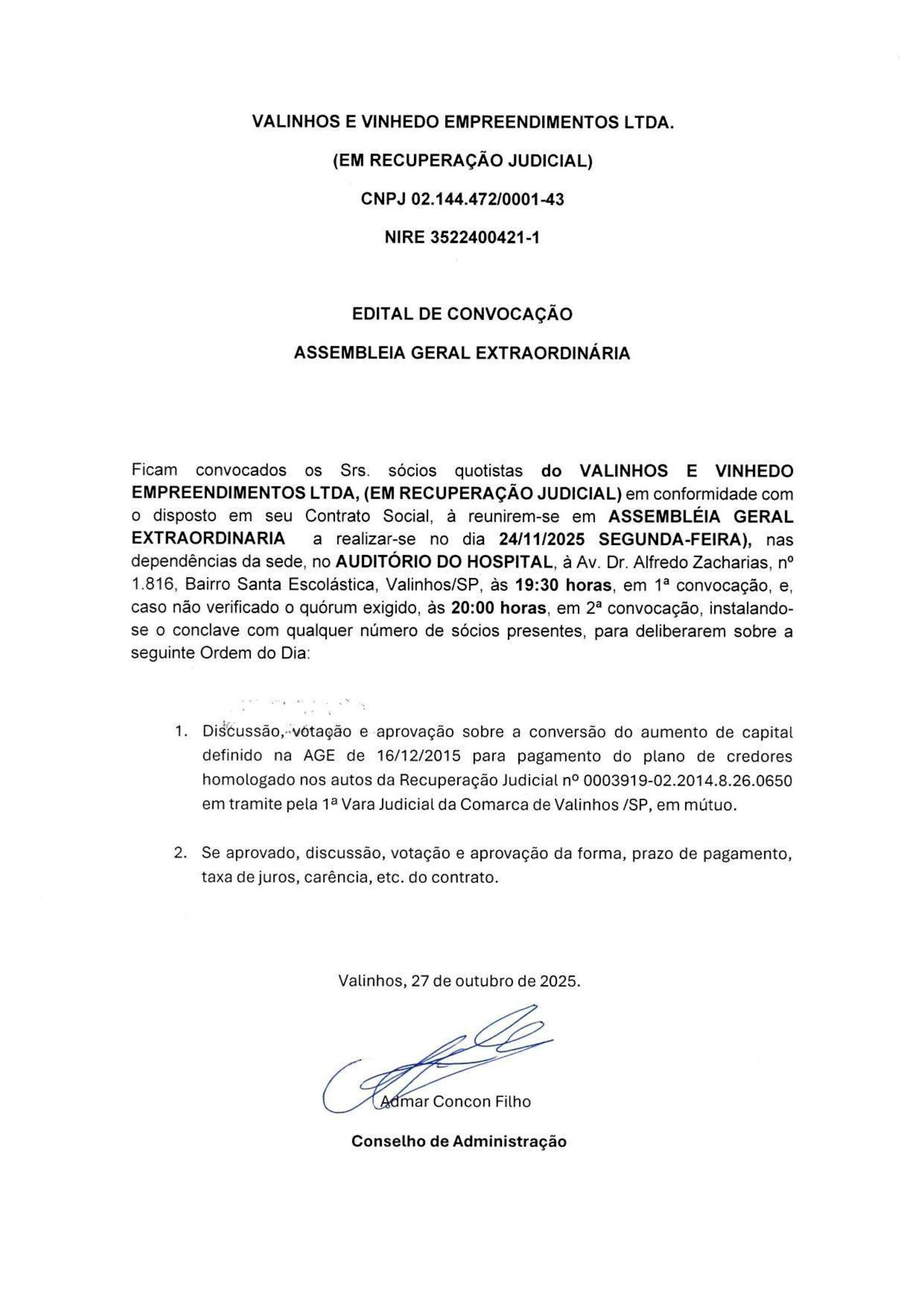Ficam convocados os Srs. sócios quotistas do VALINHOS E VINHEDO EMPREENDIMENTOS LTDA., (EM RECUPERAÇÃO JUDICIAL) em conformidade com o disposto em seu Contrato Social, a reunirem-se em ASSEMBLEIA GERAL EXTRAORDINARIA a realizar-se no dia 24/11/2025 (SEGUNDA-FEIRA), nas dependências da sede, no AUDITÓRIO DO HOSPITAL, à Av. Dr. Alfredo Zacharias, nº 1.816, Bairro Santa Escolástica, Valinhos/SP, às 19:30 horas.