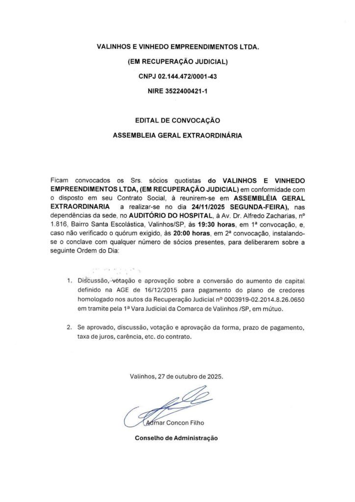 Ficam convocados os Srs. sócios quotistas do VALINHOS E VINHEDO EMPREENDIMENTOS LTDA., (EM RECUPERAÇÃO JUDICIAL) em conformidade com o disposto em seu Contrato Social, a reunirem-se em ASSEMBLEIA GERAL EXTRAORDINARIA a realizar-se no dia 24/11/2025 (SEGUNDA-FEIRA), nas dependências da sede, no AUDITÓRIO DO HOSPITAL, à Av. Dr. Alfredo Zacharias, nº 1.816, Bairro Santa Escolástica, Valinhos/SP, às 19:30 horas, em 1ª convocação, e, caso não verificado o quórum exigido, às 20:00 horas, em 2ª convocação, instalando-se o conclave com qualquer número de sócios presentes, para deliberarem sobre a seguinte Ordem do Dia:
