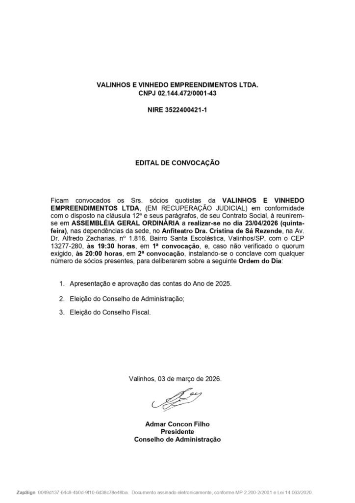 VALINHOS E VINHEDO EMPREENDIMENTOS LTDA. CNPJ 02.144.472/0001-43